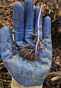 Some of the stems and plant material that went into the bed came from our temporary compost cylinders that we used over the summer. After emptying them, Lilly found a layer of rich soil at the bottom, and inside that, a handful of sprouting potatoes. The tenacious spuds had escaped last summer's harvest and weathered the heat and cold in their insulating compost.