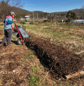 In-between our big projects, the ongoing preparations for spring carry on. We lay leaves down on the newest beds, covering them with row covers to protect them from the high winds which often tear across our hilltop. We rake mulch into pathways and tractor in new soil for beds. Our cat helps by sitting on different surfaces and meowing occasionally.