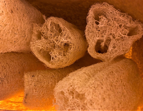 Our luffas have at last dried enough to be peeled. When they are ready, their skin feels loose to the touch, dry but not desiccated. We cut both ends off and then tear a seam down the length of the gourd. Then, the skin can be peeled off quite easily, leaving behind the inner framework fiber. (It's as satisfying as it sounds). The sponge gets rinsed and set out to dry. In a few days, it becomes dry but not brittle. The loose seeds can be tapped out, and then the luffa is ready to be used as a sponge for dishes, cleaning, or exfoliation.