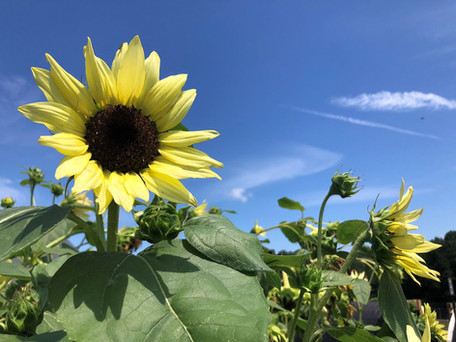 Once the beds were cleared, we sowed sunflower seeds. Throughout July we've also planted zinnias, okra, beans, and squash. Big summer seeds like this are sown directly into the garden. In the heat, water basically evaporates as soon as it touches the ground, so keeping the seeds wet is a daily labor. But there's nothing more rewarding than little green leaves poking up from the earth.