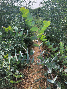 I've found a particular favorite of mine to be the eucalyptus. After huddling all winter in the shelter of row covers, it's finally stretching its elegant, silver-green limbs. It's taller than me now, which admittedly isn't that tall. It seems to relish the heat that has scared the collards and peas into next fall.