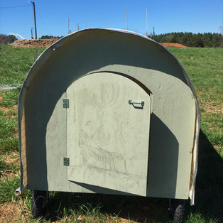 We cut the tops of two plywood boards into curves and mounted them on either side of a wooden frame. Each wall board got a door: one for humans, and one automatic door for chickens. We covered the frame with chicken wire and then a sturdy tarp. The final coop looks kinda like a covered wagon, but more stable and snug.