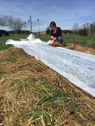 When the troughs were all filled, we placed a strip of specialized fabric over the entire row. The fabric will keep the seedlings warm and damp while they become a little more hardy. Soon we will raise the fabric up on arches into tiny greenhouses, just like we have with other rows. Inside these little homes, the plants can stretch and grow strong.